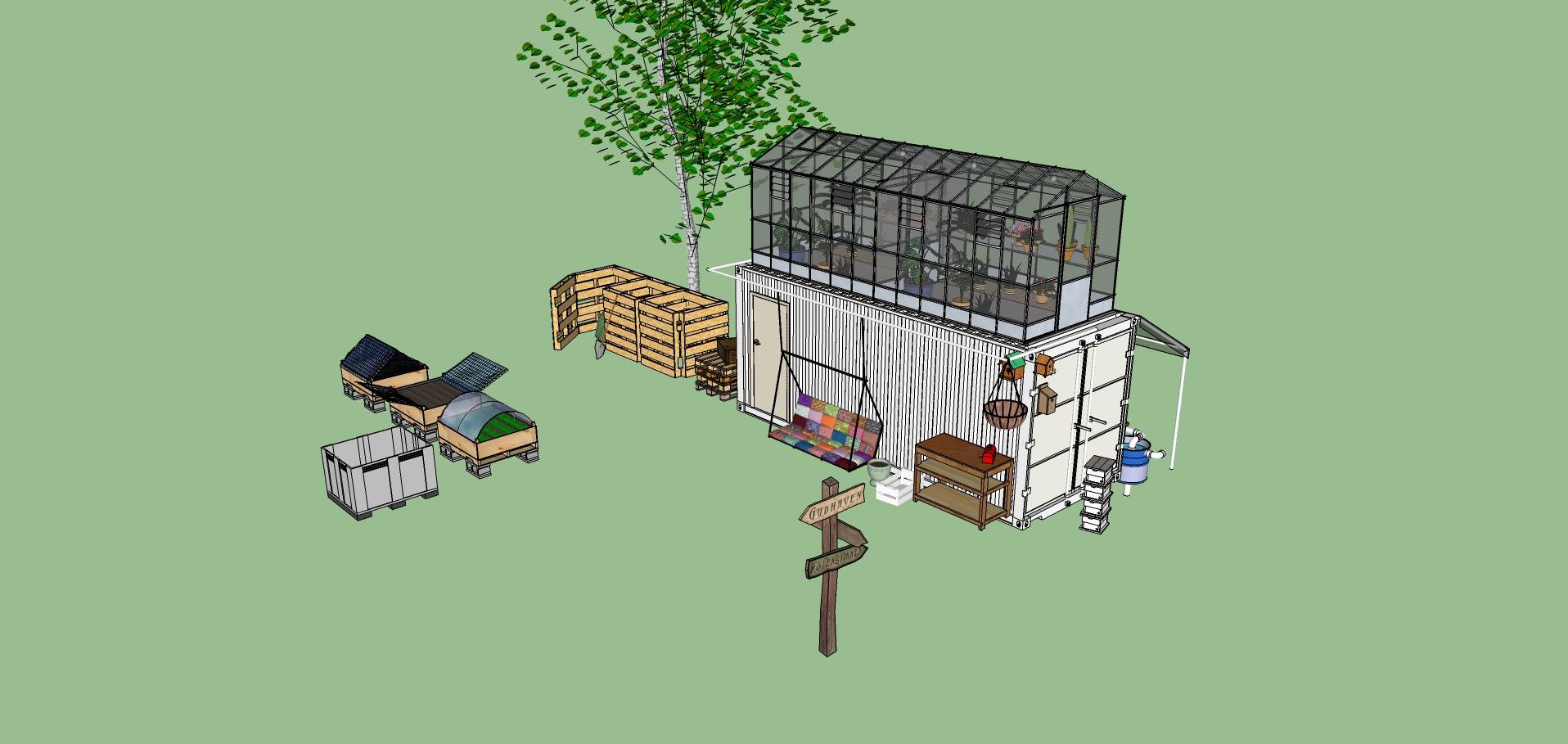 Áhersla er lögð á að almenningur og íbúar í hverfinu hafi aðgang að húsnæðum borgarbýlsins. Húsnæðin verða byggð úr tyrftum og einangruðum gámum. Eitt húsnæðið er miðstöð fyrir almenning og starfsfólk garðsins. Þar er hægt að hittast og jafnvel halda námskeið og aðrar samkomur.